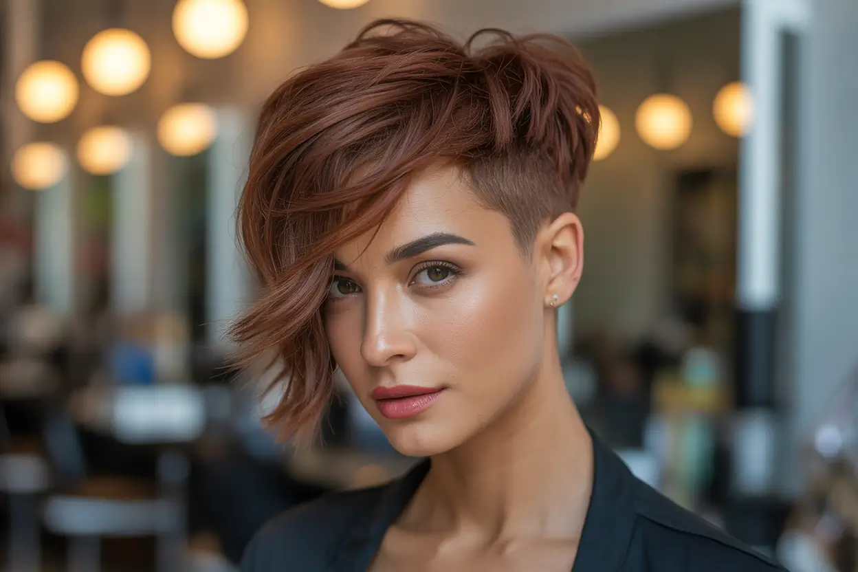 Here is where the edgy bob haircut undercut asymmetrical pixie meets the pure sophistication. The copper tone is warm and the part of the front which is clean and longer provides structure which beautifully sharpens the features in the face. It is the ideal appearance of a person who desires something smooth yet expressive and can wear it straight or with a texture according to his or her mood.