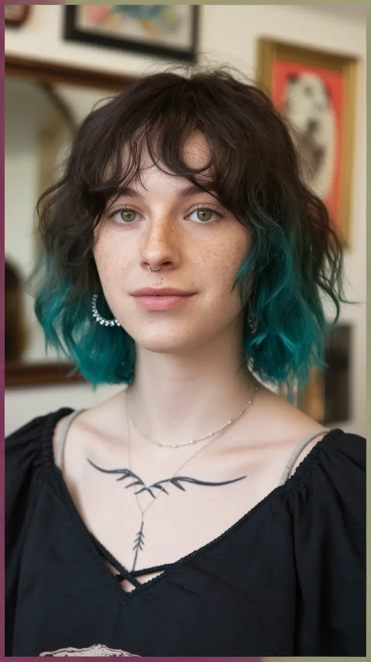 There is a certain rebellious and artistic aesthetic to the choppy, textured bob that melts into teal ombré. Soft waves, along with bangs that are not overly styled, certainly earns this style a spot under the realm of 2025 summer bob hairstyles, reminding me of the effortless indie summer goddess vibe.