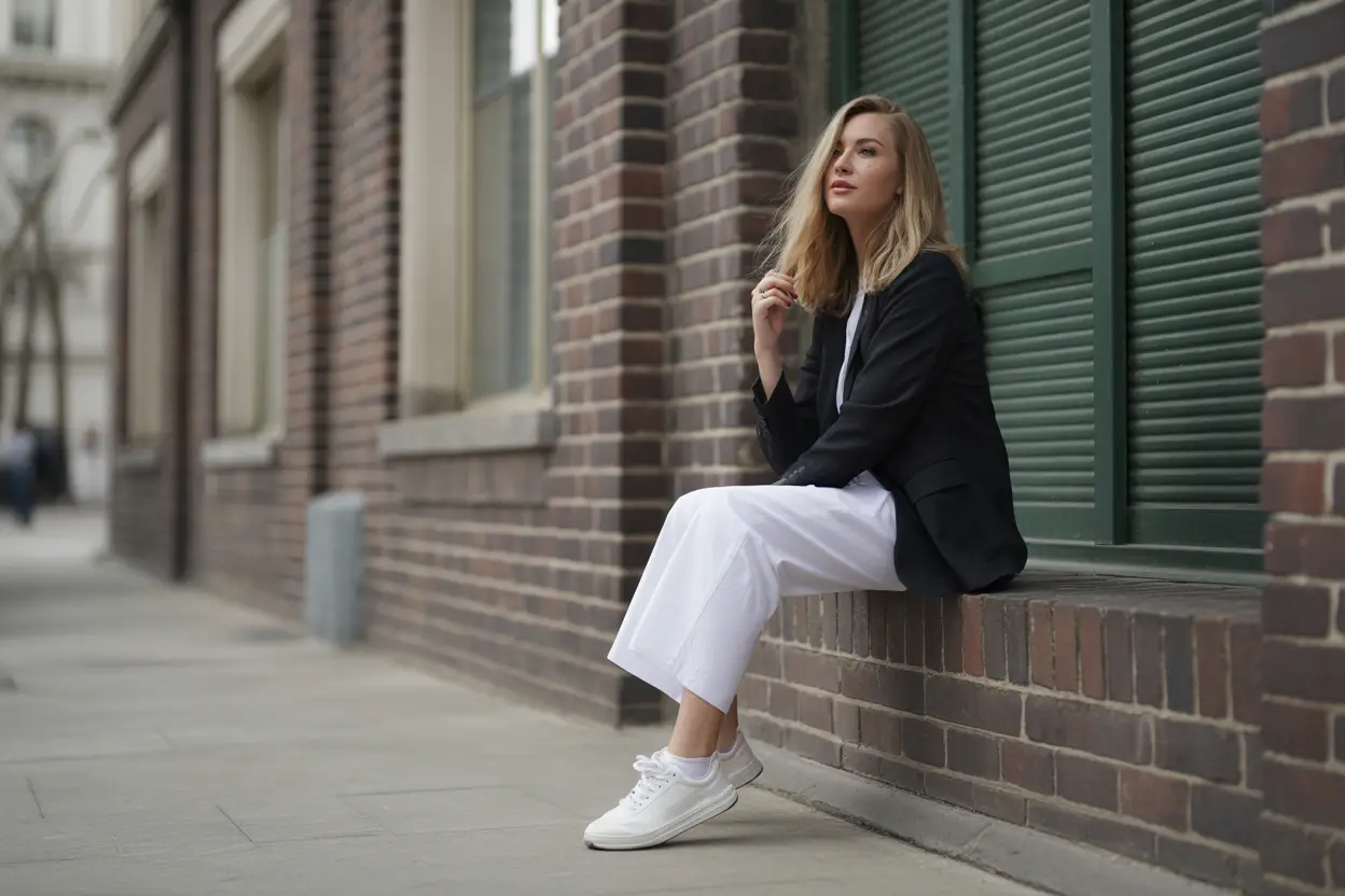 I’ve worn versions of this outfit more times than I can count, especially on days when I don’t want to think too hard but still want to look pulled together. There’s something reassuring about white sneakers here — they don’t steal attention, they support the look. Fashion editors at Vogue often talk about spring dressing being about lightness, and this kind of outfit gets that exactly right.