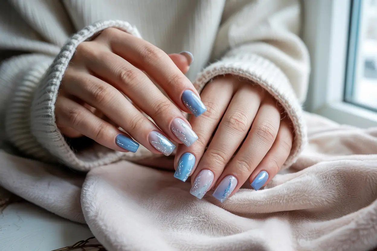 I recommend using Gelish Arctic Freeze with touches of CND Winter Sky and chunky silver glitter near the cuticle. These simple ideas keep nails clean yet striking, especially if you’re into minimalist winter beauty.
