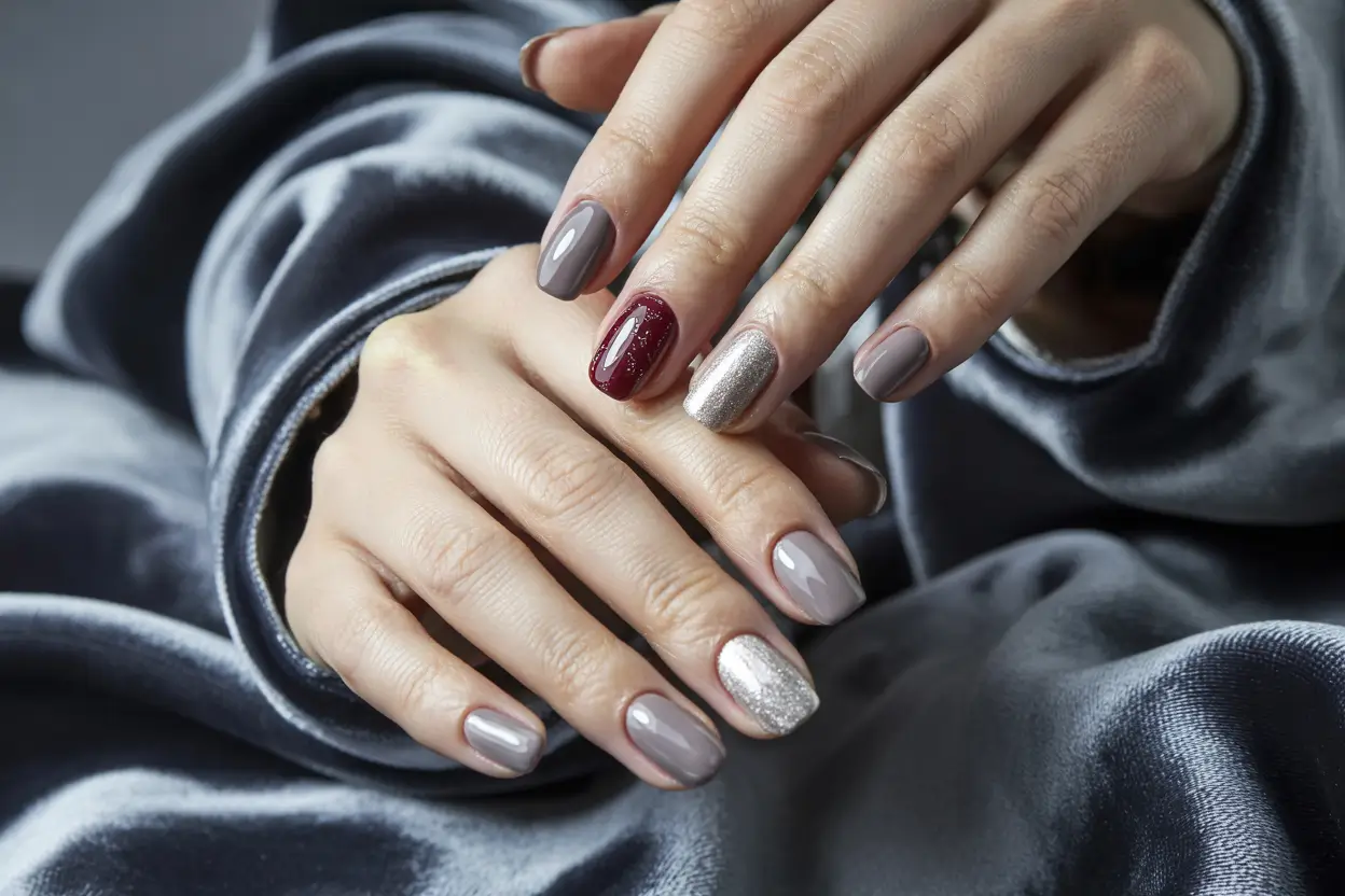 Dark, rich, and mysterious — this manicure blends deep red, plum, and a touch of sparkle to create a layered jewel tone effect. It’s one of the most flattering looks for any skin tone.