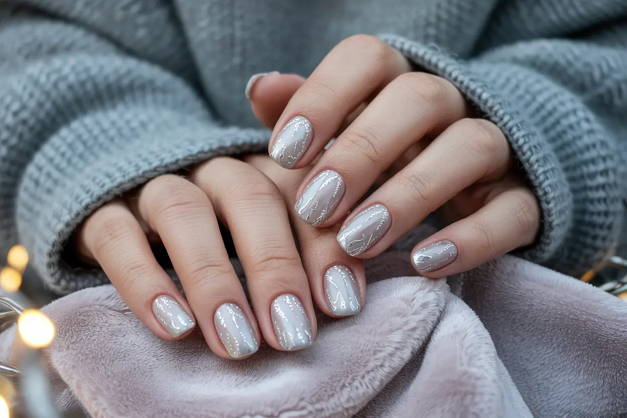 Muted beige meets soft gray and silver glitter — a simple, clean design that radiates calm sophistication. The finish is glossy but not over-the-top, a true inspo for minimalist winter style.