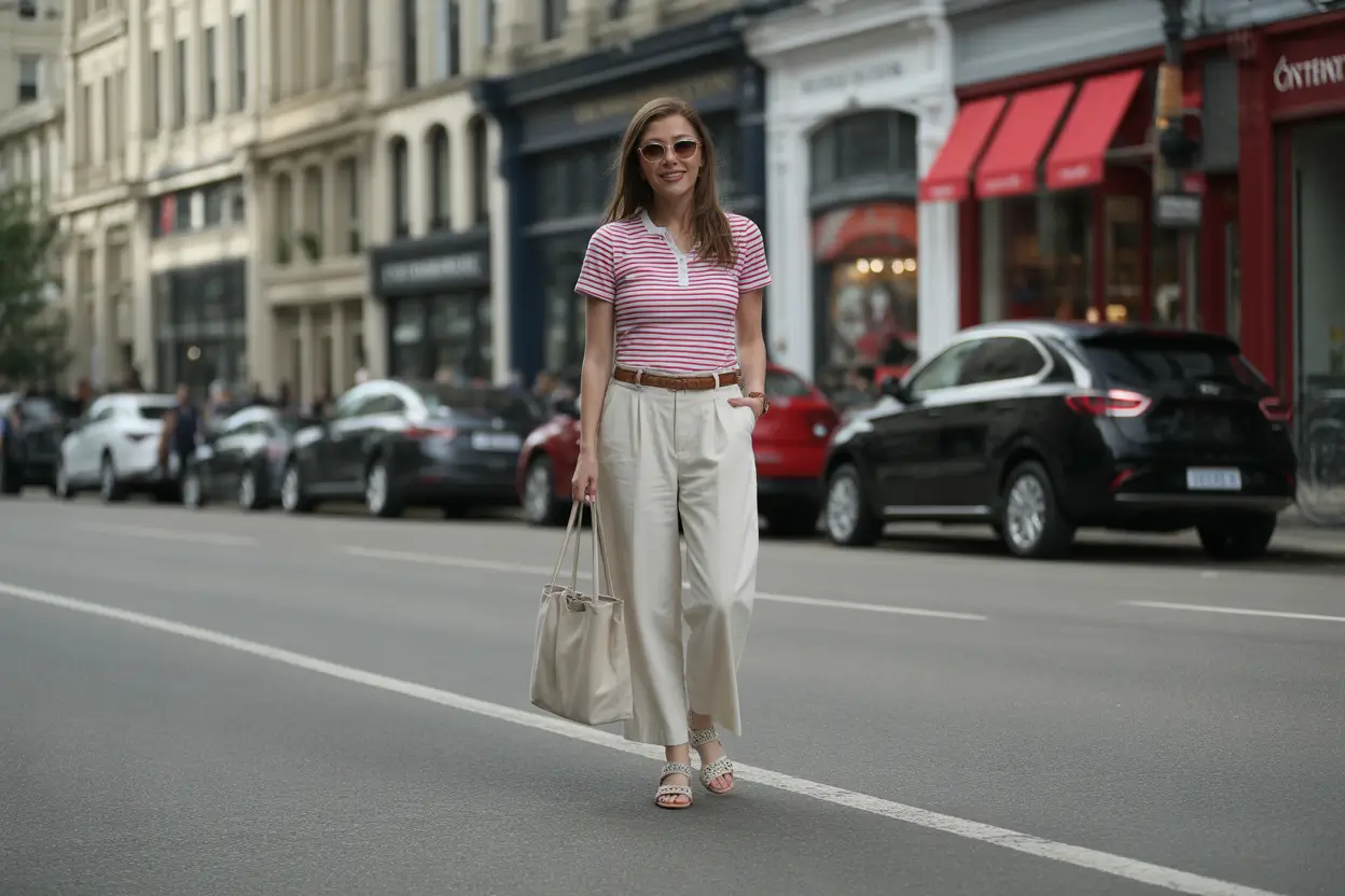 Stripes have a way of instantly lifting a look, especially when paired with soft neutrals. This outfit feels Casual chic, lighthearted, and perfectly suited for sunny afternoons.
