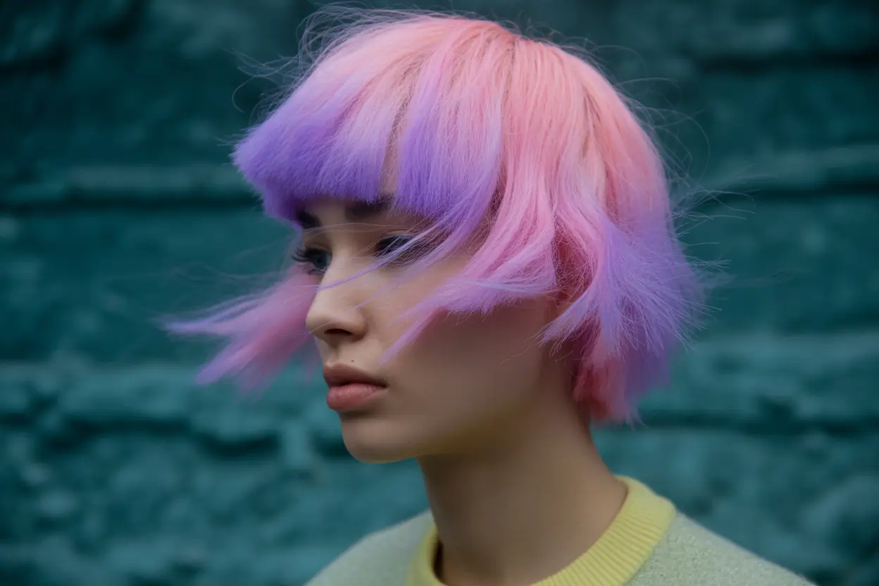 This version takes a strong movement direction. The crown remains Short, slightly rounded, the lower layers being longer and less weighty, and forming that familiar jellyfish figure, without any angular lines. What strikes me at once is the effect produced by the location of the colors, enhancing the cut, green melting into teal, leading the eye down. The form is light, bordering on liquid, and so it is best used with Wavy hair or fine Straight hair that requires visual density.